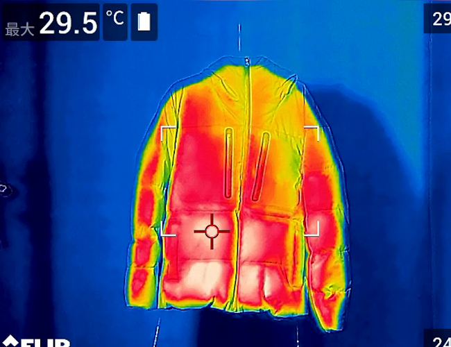 bouncyでもHEAT-X グラフェンダウンにライトを当てて試したところ、10分後の温度が常温から約30℃まで上昇していた。