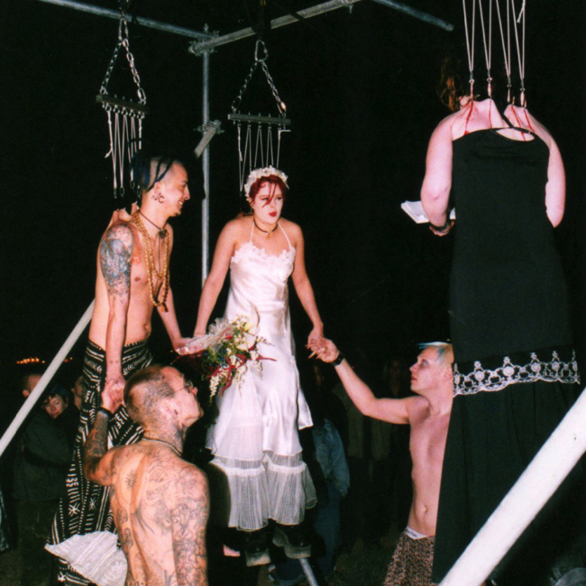 僕が立ち会った驚くべき実演ショーは2001年にラスベガスで行われたサスペンション結婚式だ。野外に巨大な櫓が組まれ、新郎新婦ばかりか牧師も吊られ、宙吊りの状態で愛の誓いが交わされた。