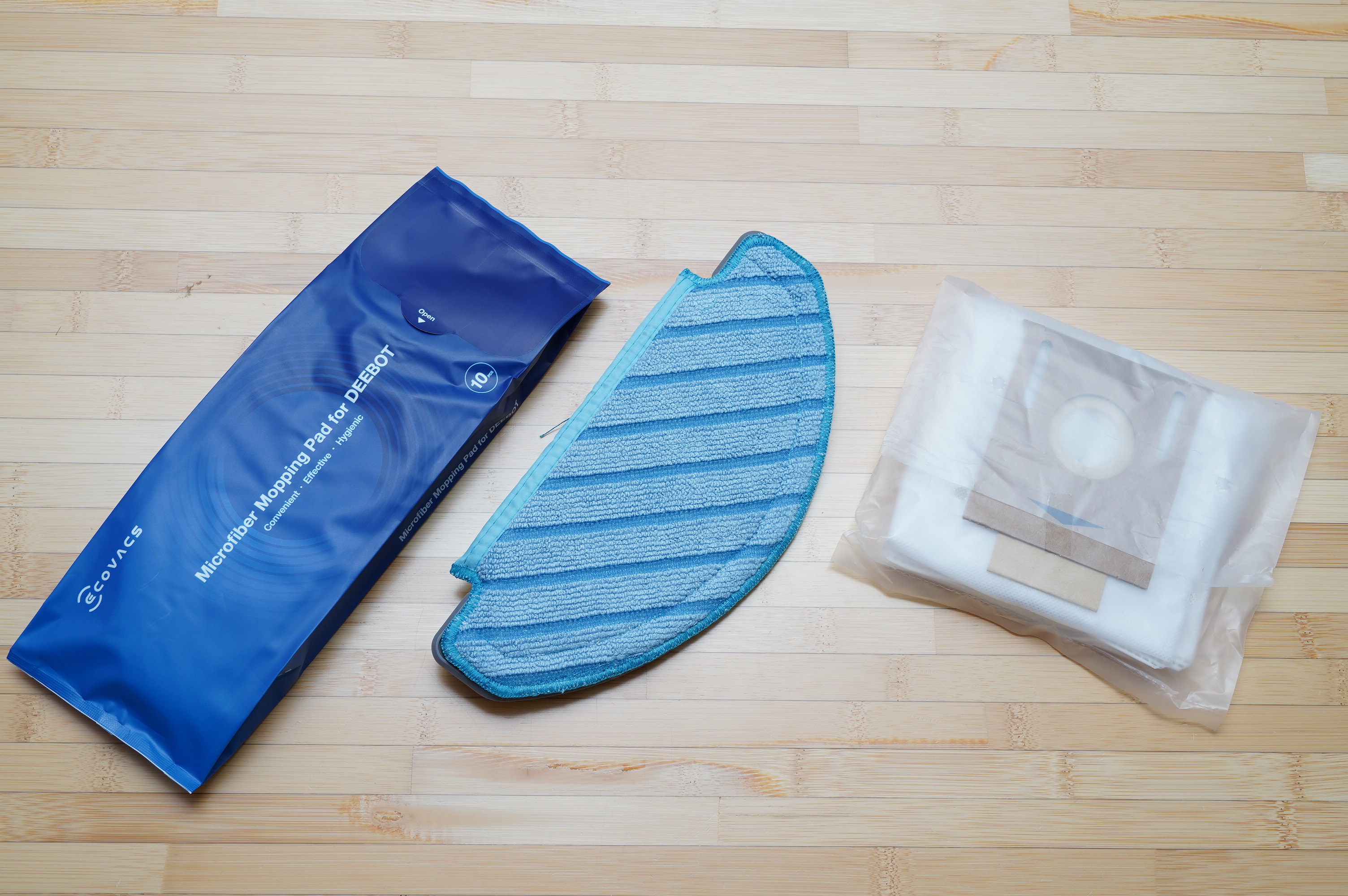 使い捨てのクリーニングモップ10枚、水洗いで繰り返し使えるクリーニングモップ1枚、交換用エコ紙パックが1枚付属(もう1枚は本体にセット済み)。