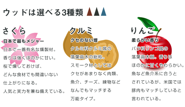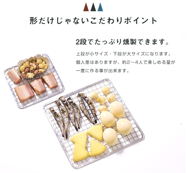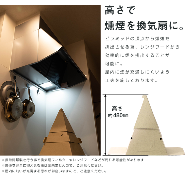 また、ピラミッド型になっているのは、燻煙を底から頂上へ垂直方向に上昇させるためで、食材にしっかりと香りがつきやすくなるらしい。