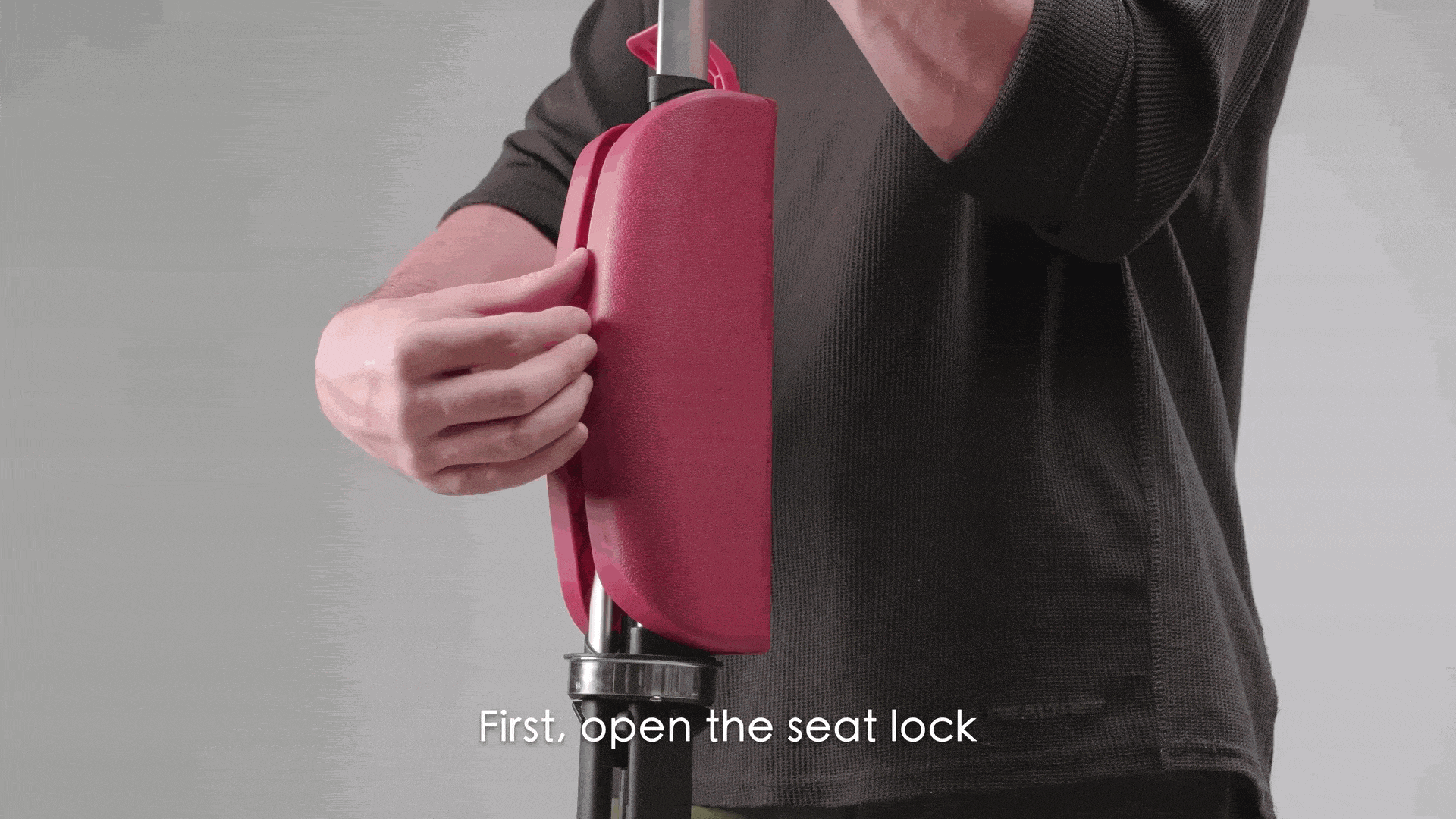 座る時は、ロックしてあるシート部分を開いてから、カチっと固定されるまでスライドさせるだけ。わずか1秒ほどでイスになる。