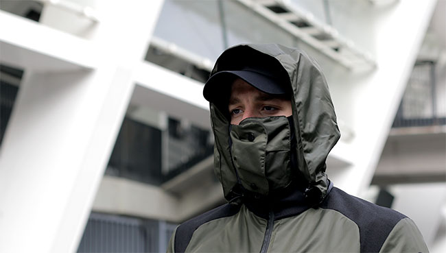 ダウンジャケットのようにモコモコせず、細身なのも特徴。スリムな外観でスタイリッシュに着こなせそうだ。またフードとフェイスマスクも備え、顔まわりも温かく保てるだろう。
