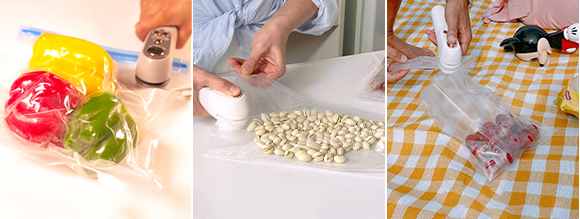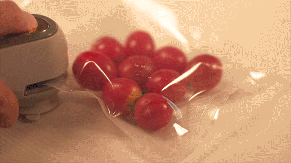真空ポンプ機能は、袋のサイズや厚さに関わらず市販のほとんどの真空袋と互換性がある。真空口がない普通の袋でも、食品を入れたらまずヒートシールモードで袋を閉じ、袋の隅を選び真空モードに。空気を吸ったらヒートシールモードに変更して真空口を閉じれば完成だ。真空口のある袋は、真空口の上に吸引口を置くだけのワンタッチで真空にできてしまう。