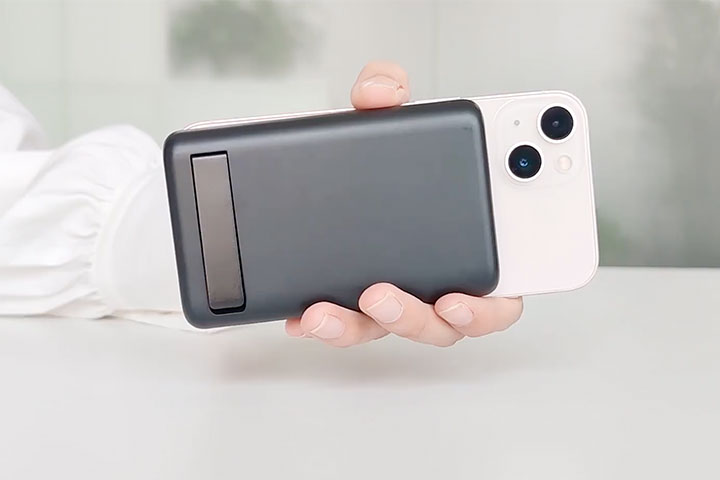 MagSafe対応のiPhoneであれば、背面にマグネットでくっつけて充電可能。邪魔なケーブルがなくてスマートだ。MagSafe非対応のiPhoneやAndroidスマホにはくっつかないが、Qiワイヤレス充電対応機種ならば充電OK。バッテリー容量は10,000mAh。