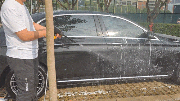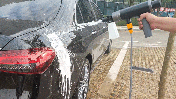 また、付属の洗剤ポッドに洗剤を適量入れると水と同時に泡も噴射する。ノズルで均一に噴射していくため、ムラなく素早い洗浄が可能だ。