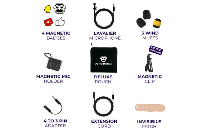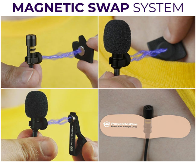 マイクを衣類の表側に装着できるマグネットホルダーも付属。状況に応じて使い分けられる。