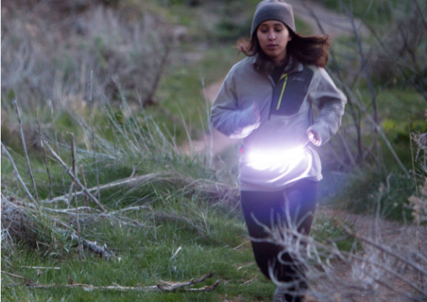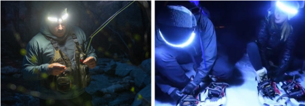 「One80HeadLamp」は、100m先までのスポット照射が可能なセンターライトを搭載。その左右には帯状のLEDがあり、周囲180°を照射して周辺の広い視界を確保できる。