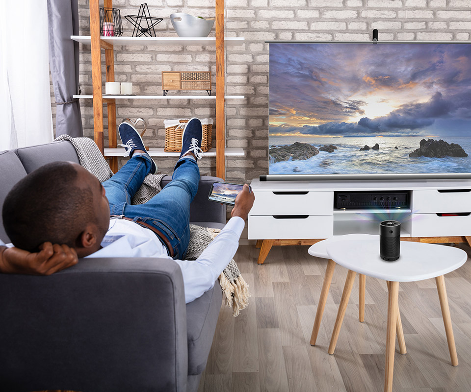 Wi-Fi経由で、スマホやタブレットと接続可能。コードレスで使用できるため、置く場所を選ばない。また、スマホやタブレットなどの画面をそのまま表示可能なミラーリング機能も搭載されている。