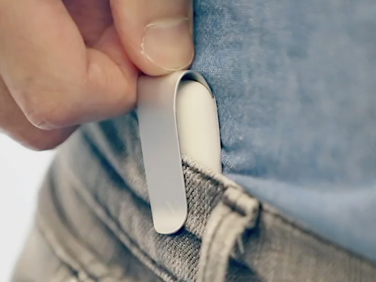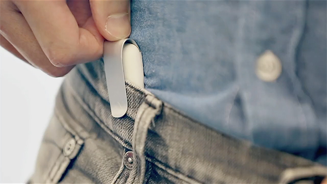 クリップ型で10gと軽く、ズボンやスカートなどのウエスト部分に装着して使用する。計測データはスマホアプリで記録・確認。