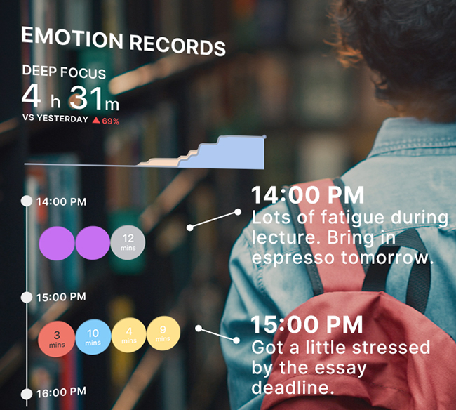 メンタル状態は「集中しているとき=肌色」「注意力散漫なとき=灰色」「ストレス状態のとき=赤色」といった具合に色分けされていて、ぱっとひと目でわかりやすい。