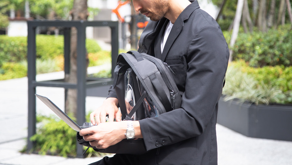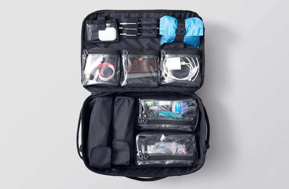 「VOLVE」のサイズは26.5×40×12cm。内装は中身が一目瞭然にわかる透明素材の収納ポーチで区分けされており、使い方にあわせてレイアウトが変更できるのも魅力だ。しっかり固定されているので、走って揺れてもバッグの中身が崩れることはない。