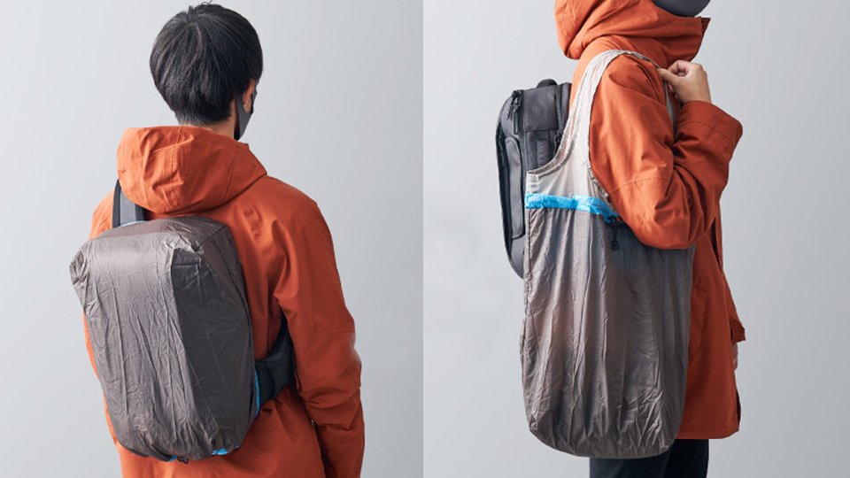 ポーチの中にはコンパクト収納で大容量のエコバッグが付属しているので、急な買い物があった時に利用できるのが嬉しい。しかも雨天時にはエコバッグがレインカバーに早変わりし、大切なバッグの中身を保護してくれる。