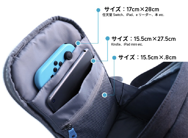 内部には合計7つのポケットやケーブル専用の収納スペースが用意されている。ゲームや財布、カメラ、モバイルバッテリー、スマートフォンなどたくさんの物を整理整頓しながら収納できる。