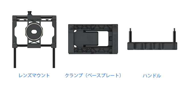 基本となるカメラリグ「Beastgrip Pro」は、レンズマウント、クランプ(ベースプレート)、ハンドルの3つのパーツで構成されており、必要に応じてセパレートできる。