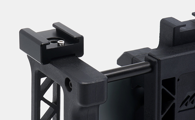 一般的なカメラリグと同様に、それぞれのパーツには1/4インチのねじ穴がついている。シューマウントを取り付けるなど、容易にアクセサリーを拡張できる仕様になっている。