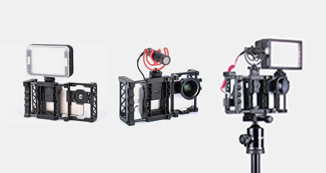 例えば、音声収録用のマイクやLED照明をプラスしたり、三脚に固定したりと、スマホで本格的な撮影キットを、手軽に組めるのがポイントだ。