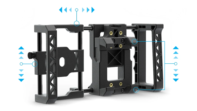 可動式のレンズマウントは、スマホのカメラ位置に合わせて調整可能。スプリング付きのクランプはスマホサイズに合わせて調整し、しっかりとグリップできる。
