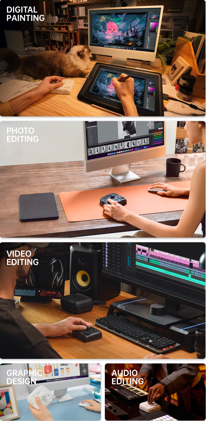 汎用性も高く様々なクリエイティブソフトで使用できるほか、WordやExcelといった事務系のソフトでも使える。もちろん、操作の割り当てはソフト毎に設定可能。ソフトをアクティブにすることで自動的に動作が切り替わるので、ソフト間をまたぐような作業でもシームレスに行える。