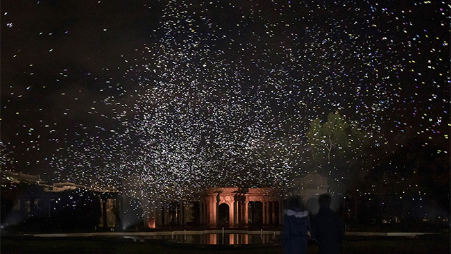 最大の特徴は、ひとつひとつの火花が生分解性素材からできていることだ。花火、風船、ドローン、紙吹雪などの従来の手法と異なり、環境に悪影響を与えにくく空中を演出できるという。