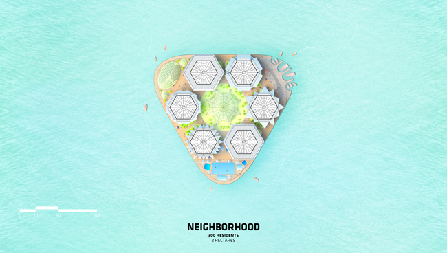 2ヘクタールの六角形モジュール式居住区は、最大300人の居住者による自立したコミュニティを形成する。農場や養殖場、真水生成システム、浮体式風力タービンやソーラーパネルを用いて食料とエネルギーを自給自足できる自立型都市を目指しているという。コミュニティ施設やアミューズメント施設、商業施設などの機能を持つ海上都市内を住民は徒歩やボートで移動できるらしい。