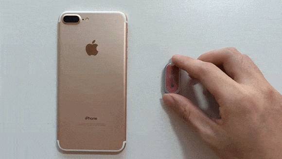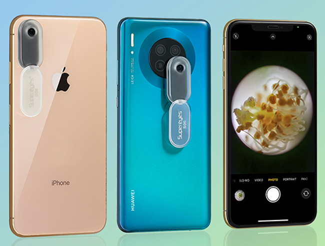 「SuperEyes」は、一瞬でスマホが顕微鏡に早変わりする外付けレンズ。電力は不要。繰り返し使える粘着性ゴムでスマホのカメラに貼るだけ。サイズは18×36×7mmとコンパクトで、重さは5g。誰でも簡単に取り付けてミクロの世界を楽しめる。