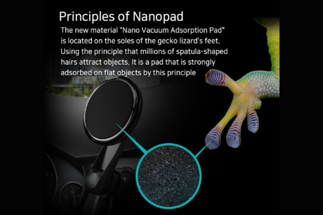 「NANO PAD」は、新素材Nano Vacuum Adsorption Padを採用する。これはゲッコートカゲの足をモデルにしたもので、磁石やテープを使わずにスマホなどを強力吸着する。