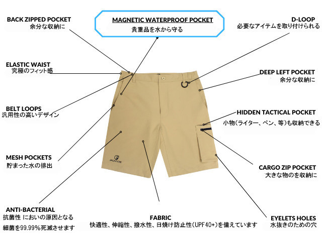 ポケットは全部で5つ。それぞれタイプが異なる。パンツは耐久性・抗菌・速乾性の素材を採用している。水泳・カヤック・釣り・キャンプ等の幅広いアウトドアシーンで活躍するだろう。