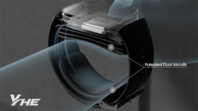 「BP Doctor MEDは、ストラップの上部と下部に膨張するカフを配置した独自の設計。ボタンを押すだけでカフが膨張し、手首を包み込んで血圧を測定する。