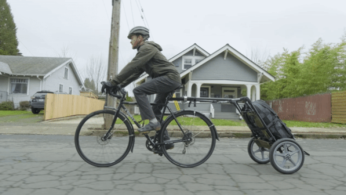 自転車で牽引もできる。ハンドルを用いて台車のように使ったり、スーツケースを引くように使ったりするのも容易だ。