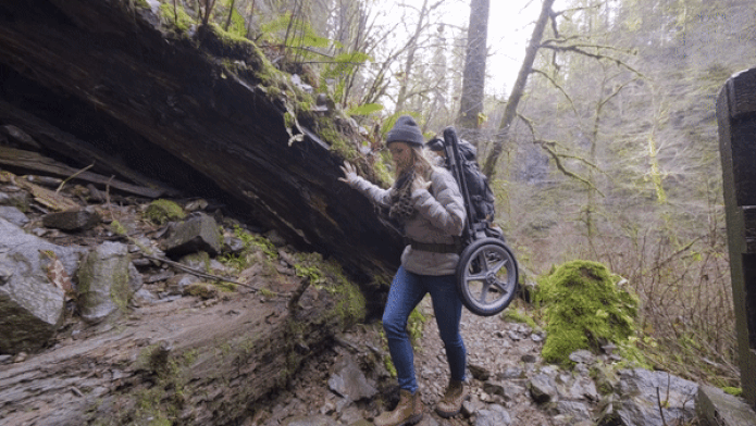 身体に合わせて調節できるから、誰でも1番楽な姿勢でバランス良く荷物を運べるようだ。ストラップで腰につけければ、両手が空く。足を動かすだけで軽々と荷物を運べるようになるから、喉が渇いたら水分補給し、気になった景色があれば写真を撮ることもできる。