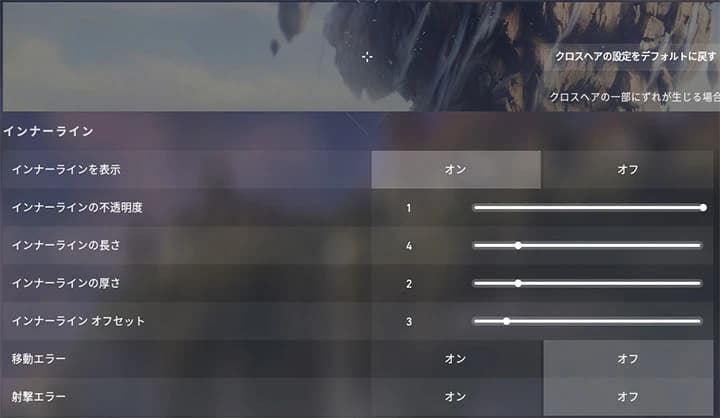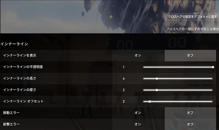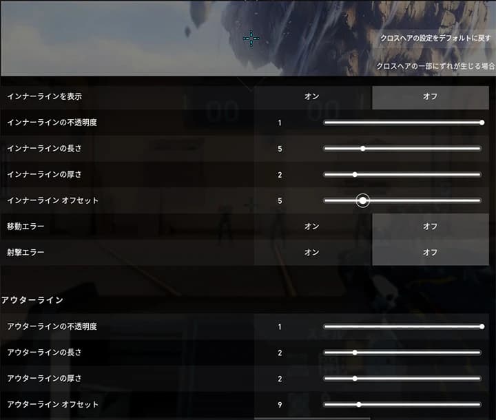 「オフセット」はクロスヘア内側の間隔をどれだけ開けるかという設定です。中距離(20m)くらいで敵の頭にクロスヘアの合わせた時、敵の顔がわかるくらいに間隔を開けておくと狙いやすくなると思います。逆に、遠距離の敵にクロスヘアを合わせた時に開きすぎて狙いづらい場合は、オフセットの数値を少し下げると狙いやすくなります(下の画像参照)。