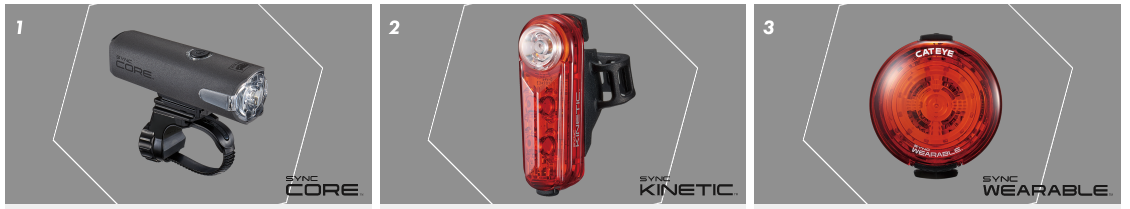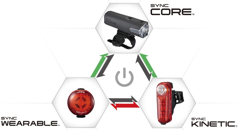 「CATEYE SYNC」シリーズは、Bluetoothに対応し機器同士が連携する自転車用ライトです。ヘッドライト「SYNC CORE」やリアライト「SYNC KINETIC」、ヘルメット後頭部やバックパックなどに装着する汎用ライト「SYNC WEARABLE」などをラインナップしています。