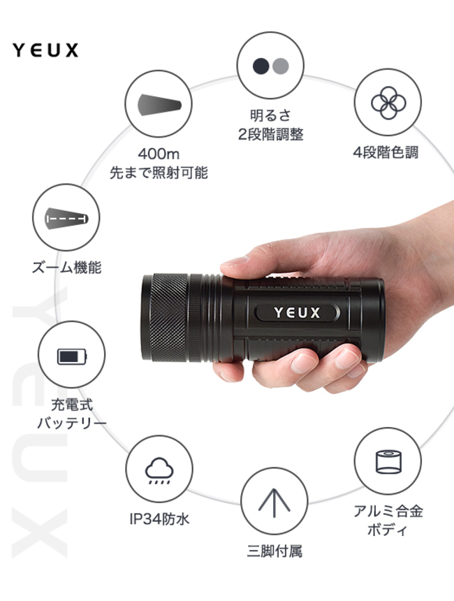 多機能LED懐中電灯「YEUX」。手元から400メートル先まで照射できる夜釣りやアウトドア、災害時にも活躍するアイテムだ。