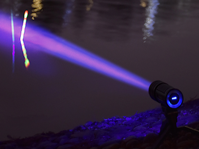 「YEUX」は大きさ52×54×146mm、約433gと手のひらサイズ。調光は強・弱の2段階、青色・紫色・白色・黄色の4色に変更できる。夜釣りの際、水面を黄色や紫色の光で照らせば集魚効果も期待できるという。