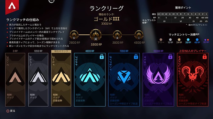 より上位のティアに進むめにはRPを一定以上獲得する必要があります。RPを獲得するには高い順位で試合を終えるか、他のプレイヤーを倒さなくてはなりません。