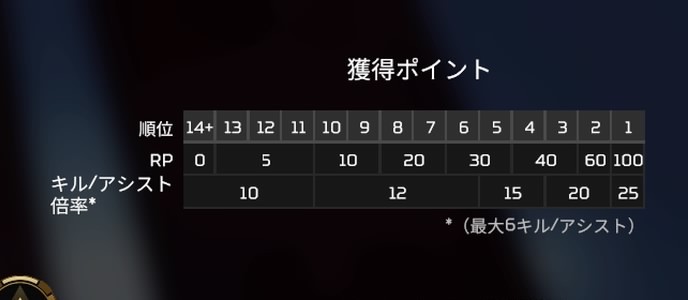 さらにキル/アシストで得られるポイントは、順位が上がるほど倍率も増えます。例えば11位までは1キル/アシスト=10RPなのが、1位になると1キル/アシスト=25RPに。つまり、6キル/アシストを取って1位で試合を終えれば250RPももらえるのです! すごい!!
