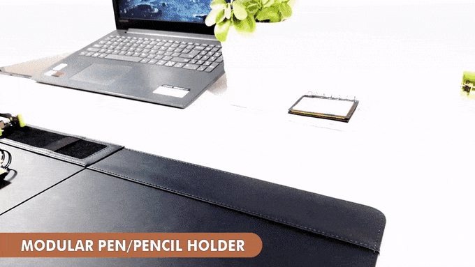 鉛筆やペン、はさみなどを1箇所にまとめて整理しやすいよう、デスクマットに磁気で結合できるペンホルダー付き。また、伸縮性のあるバンドも装備していて、ペンや付箋などを固定可能。使いたい時にすぐに取り出せる。