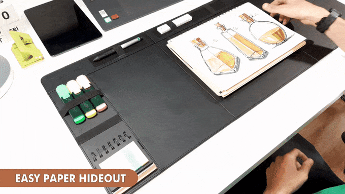 デスクマットは簡単に脱着できるので、書類やメモをマットの下にすぐ隠せる。そのため、デスク周りに書類が積み重なる心配なし。