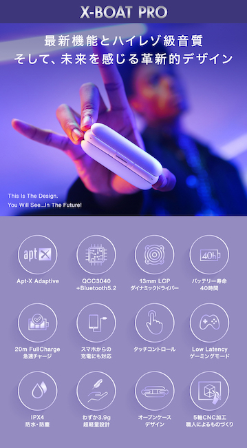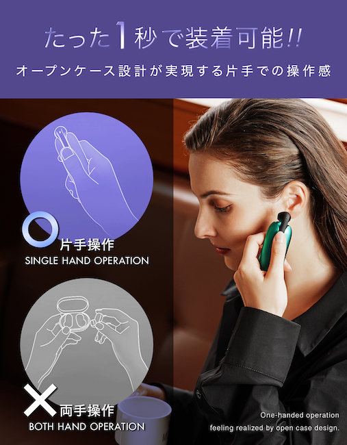 ワイヤレスイヤホンは、ケーブルが絡まるこれまでのイヤホンの煩わしさから解放した。「X-BOAT PRO」はさらにスマートに。「X-BOAT PRO」は蓋のないオープンケース設計なので、イヤホンの装着は片手でスライドさせるだけ。小さく転がりやすいものを取り出す煩わしさがなく、1秒で完了する。