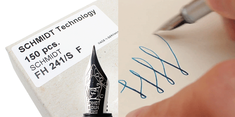 ペン先は、精巧なモノづくりで知られるドイツのシュミット製。「しなり」の効いた書き心地のよさに定評がある。字幅は汎用性の高い中字幅で、初心者でも書きやすい。日本のゼブラ製のペン先への変更もできる。
