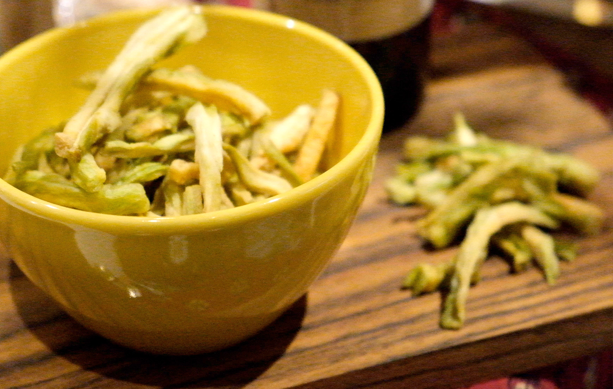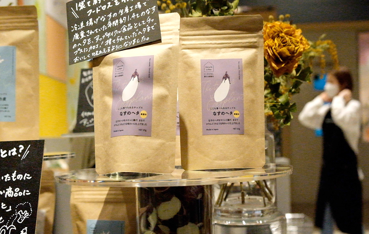 たとえば、ブロッコリーの茎。野菜の冷凍加工工場で、毎月大量に廃棄されていましたが、ココナッツオイルでカラッと揚げてスナック菓子に。同様に大根の皮やナスのヘタなども、廃棄されていたゴミ扱いから、オヤツに転生させています。