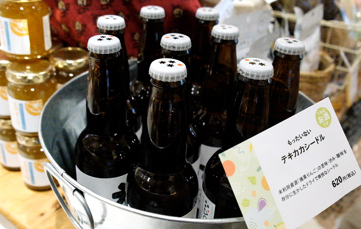 リンゴは収穫量を増やすために、未成熟のリンゴをまびく「摘果」という作業があります。こうした摘果したリンゴの果汁を使ったシードルも売っており、単においしかどうかだけでなく、興味をくすぐられる食品が並んでいます。