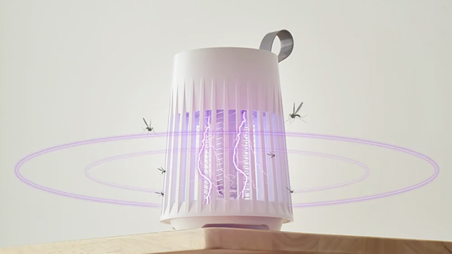 「Mosoco 電撃殺虫器」は、UV光源で虫をおびき寄せ、2200Vの電撃で殺虫する。温度と二酸化炭素で人体を模倣していて、蚊を引き寄せやすいという。