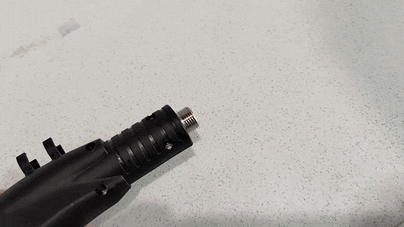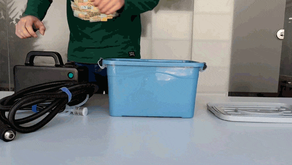 ノズルをグリップの先に取り付け、水を張った容器に給水用のホースを入れて、電源スイッチをオン。あとは水が加熱され、蒸気として噴射可能になるまで少し待てば準備OK!