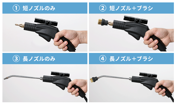 グリップには、付属品の長短2種類のノズルが取り付けられる。さらにノズルの先にも、2種類の材質の異なる洗浄ブラシからひとつを選んで装着できるので、様々な使い方ができそう。