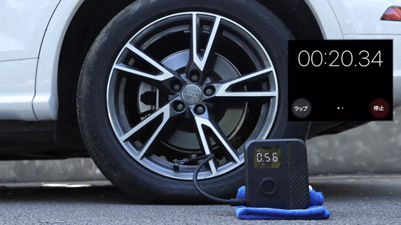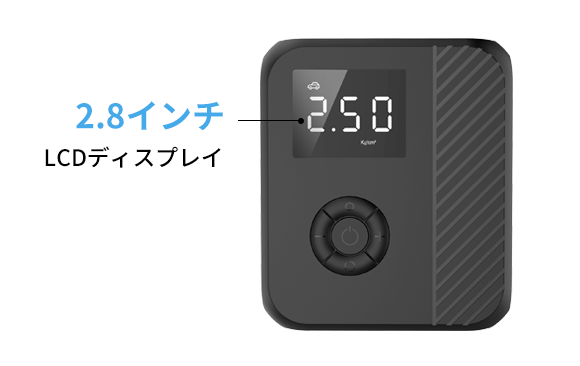 ノズルで本体とタイヤをつなぐと、タイヤの空気圧が本体にある2.8インチのLCDディスプレイに表示される。ディスプレイには空気圧のほか電池残量、空気入れモード、空気圧の単位などが表示され、情報がリアルタイムに確認できる。