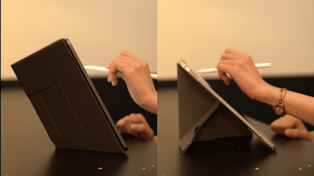 メモ&イラストモードでは、タッチペンで作業するのに最適な角度になる。ペンを使用時にも揺れたりブレたりしないという。