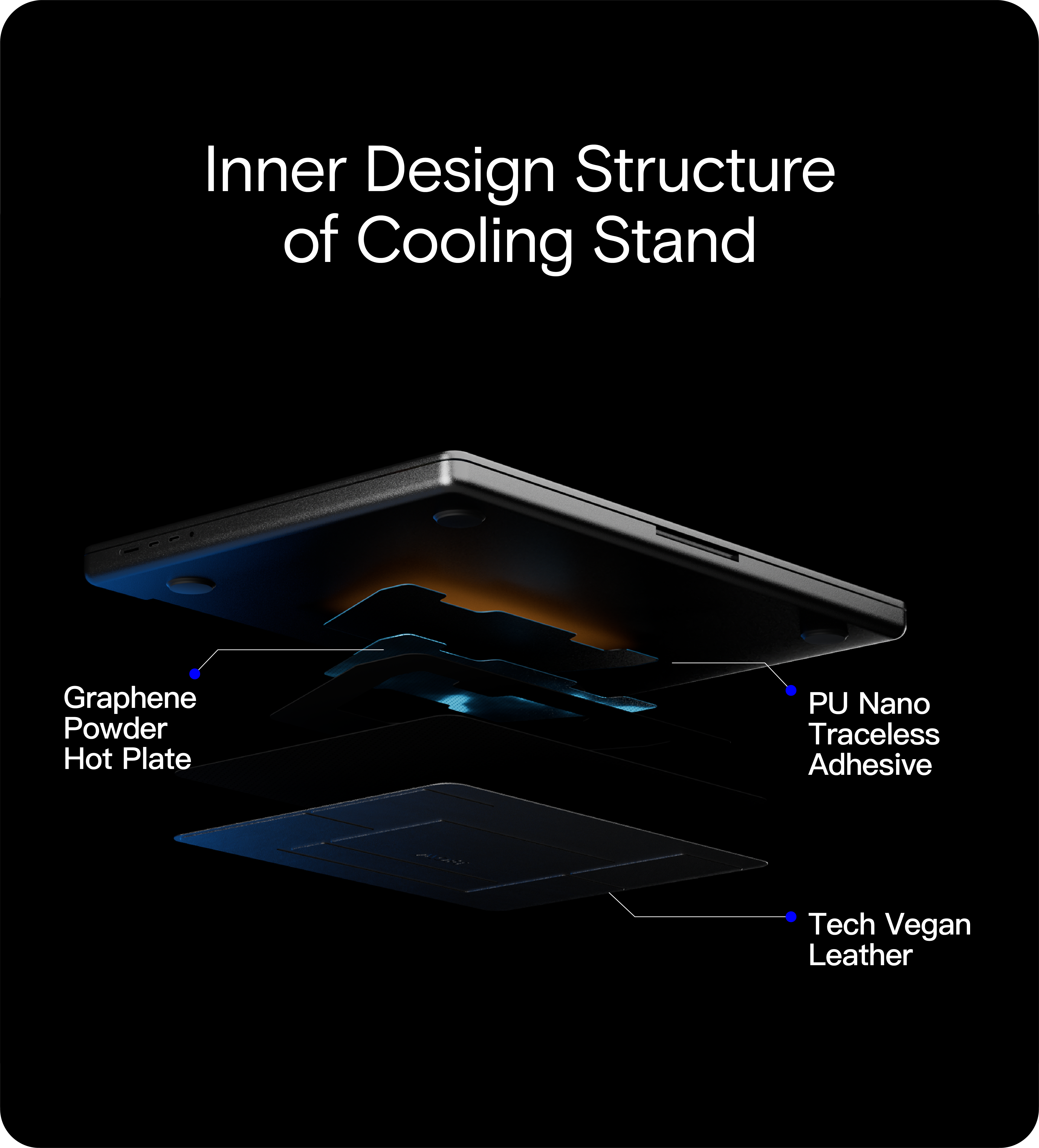 グラフェンとナノカーボン、銅を組み合わせた、厚さ0.07mmのフィルムでCPU表面の熱を低減。スタンドを立ち上げて空気を継続的に循環させることで、ノートPCを自然に冷却し続ける。室温25℃で行われたテストでは、ノートPC(MacBook Pro)の平均温度を5℃、最大で10℃近くまで温度を下げられたそうだ。