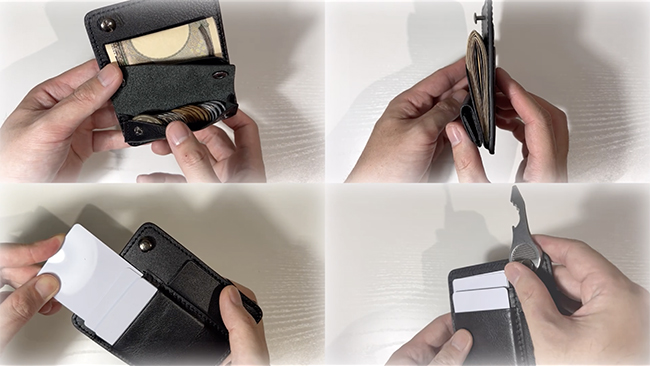 まず、約20枚の硬貨を収納できる小銭入れは、中で混ざらず見分けやすい。紙幣30枚まで入る札入れは、マネークリップのようなホルダー仕様でさっと取り出せる。