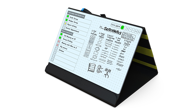 何度でも書いて消せるから、紙の無駄遣いも減らせる。文房具を収納できる付属バンドで、デスクもすっきり片付く。